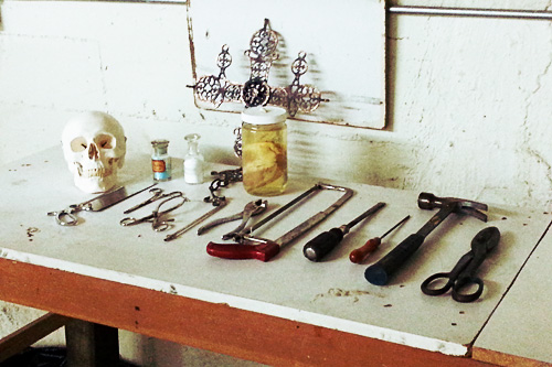 The shoot lasted from around 7 PM to 1 AM last Wednesday, which was much longer than any of us had anticipated, but it was a lot of fun. We had some great props; my co-worker rented several items from The Bone Room, including tools, poisons, and a heart in a jar, and we found several rusty, gnarly, mysterious tools in the bottom of my co-worker’s own toolbox. … Which was suspicious. The cross was already in the room where we were shooting. Nice.