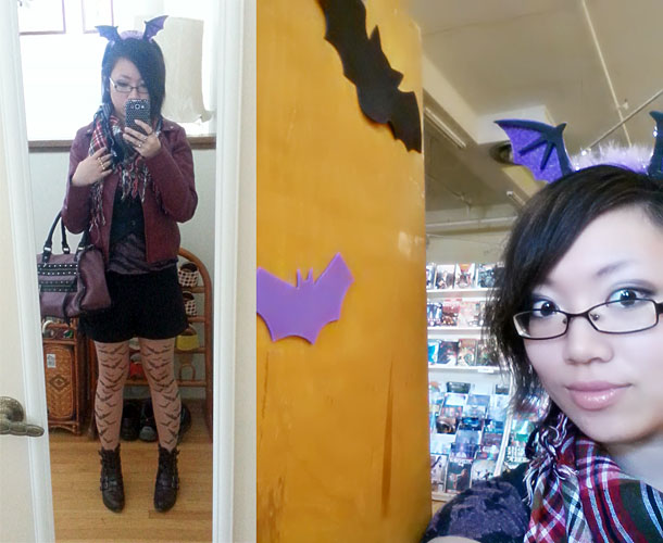 The batwing headband is from Daiso, and the bat tights are from Spirit. I love Halloween shopping. ♥