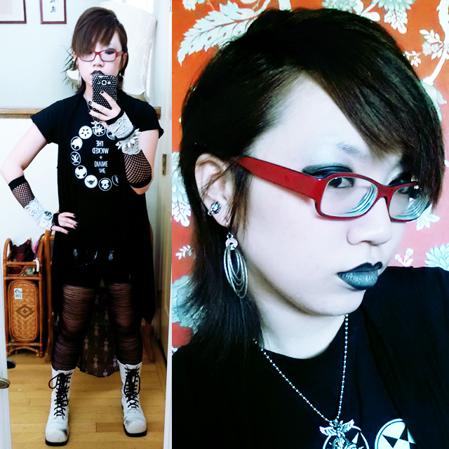 This isn’t quite what I wore on my birthday this year, but it’s the outfit I put together the week before my birthday, before I noticed the fishnet gloves from Party USA were uncomfortable and my tights had a hole in the toe and decided I didn’t want to pack my Double Deckers with me to bring to San Diego for San Diego Comic-Con.