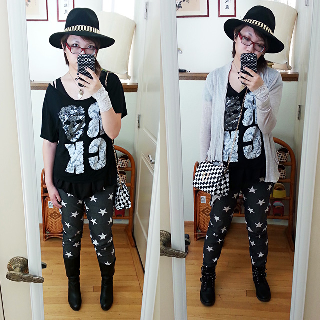 Went to the Embarcadero to pick up a visiting friend. On the left, what I was initially going to wear; on the right, what I changed into to not be cold and to be able to stand up on BART. Sometimes I change into something more practical after doing my outfit snap and leave the Internet none the wiser, but this time my outfit was still so cute that I just snapped it again.