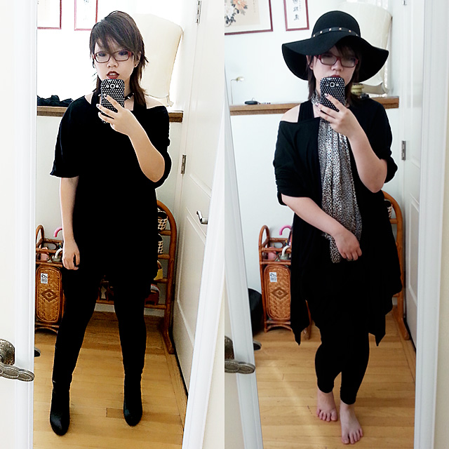The trouble with black on black on black outfits is you can’t see how super fly my layering is. Went shopping in the outfit on the left, inspired by the dark, layered style of Tatsuro, the vocalist of MUCC. Later accessorized with a wide-brimmed hat, scarf, and vest in the style of Gara, the vocalist of MERRY, circa 2006.
