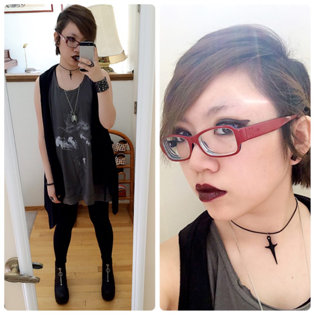 Outfit to see The Cure perform at the Shoreline Amphitheatre in Mountain View. We were on the lawn, where everybody had decided to stand up, and the vanue only has one screen that’s positioned to be visible to about a fifth of the lawn, so the view was awful, but they played all my favorites (namely “Lullaby” and “The Lovecats”) and I screamed at both.