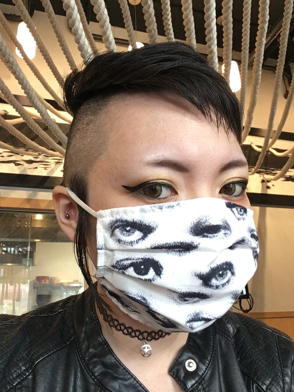 Got a haircut. I love this cut. The mask is by Corinne Elyse on Society6, although of course it’s not as good as a KN95 or a KF94.