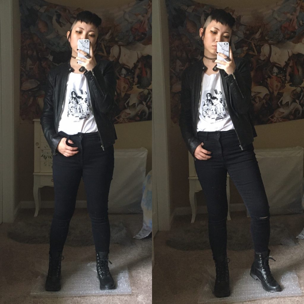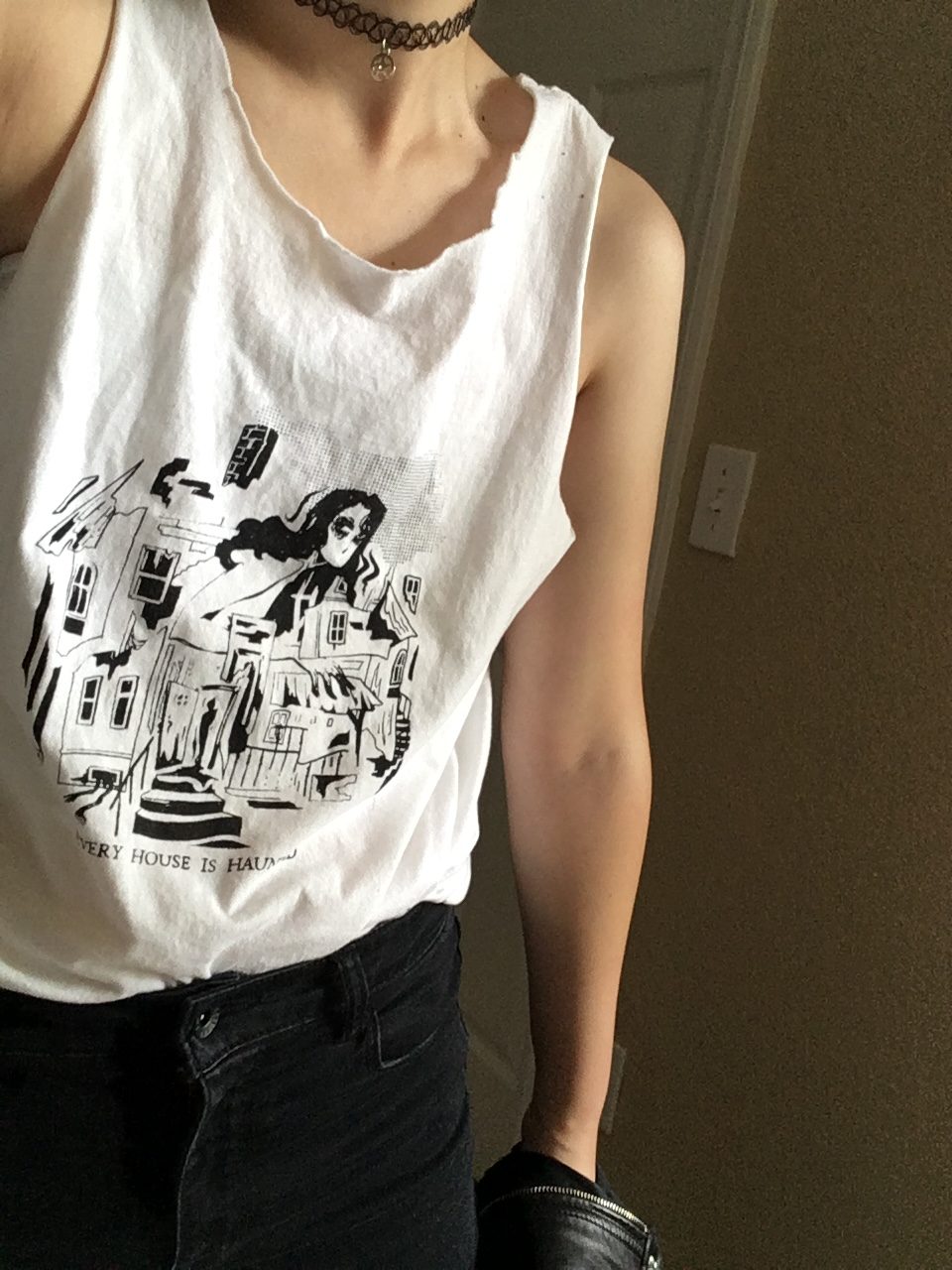 Featuring Kaylee Rowena‘s “every house is haunted” t-shirt. The print is quite small, so it’s perfect for cutting into a tank. Might cut the neckline even deeper once the medical binder comes off